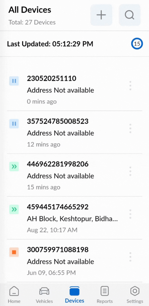 Vehicles are linked to tracking devices that transmit GPS and vehicle-related data to the server for location tracking purposes. These devices can either be physical OBD units that need to be plugged into the vehicle or GPS-enabled mobile devices. The Device List displays all such devices that have been registered on the portal.
