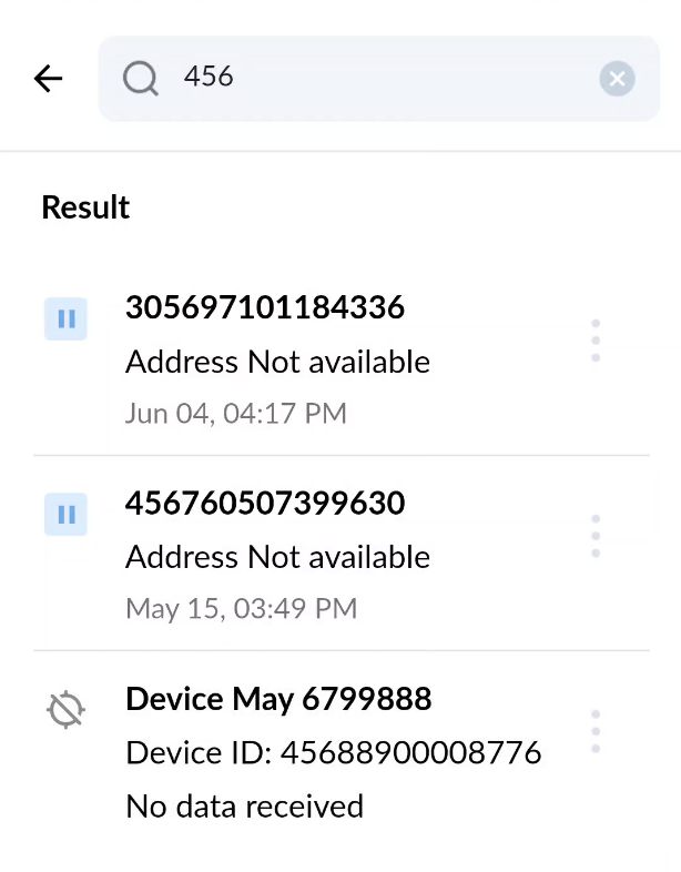 Devices can be searched using Name, Device ID/IMEI and Vehicle Plate number.