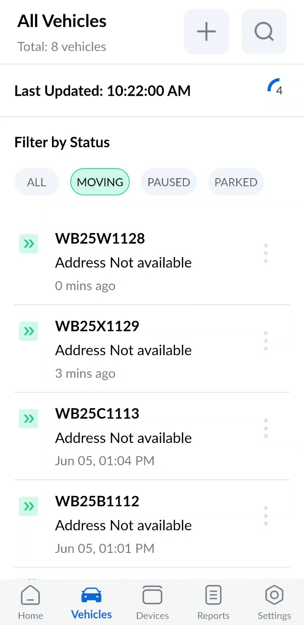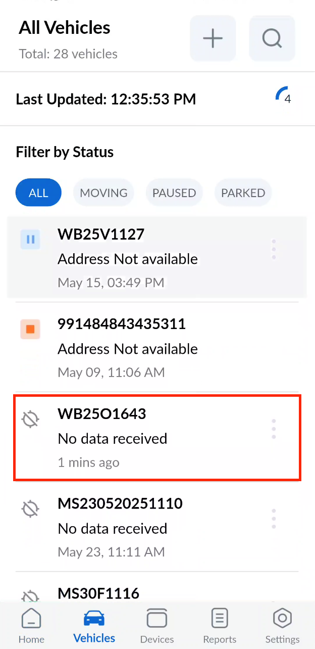 - You can filter vehicles by their status by tapping on the corresponding status buttons.
