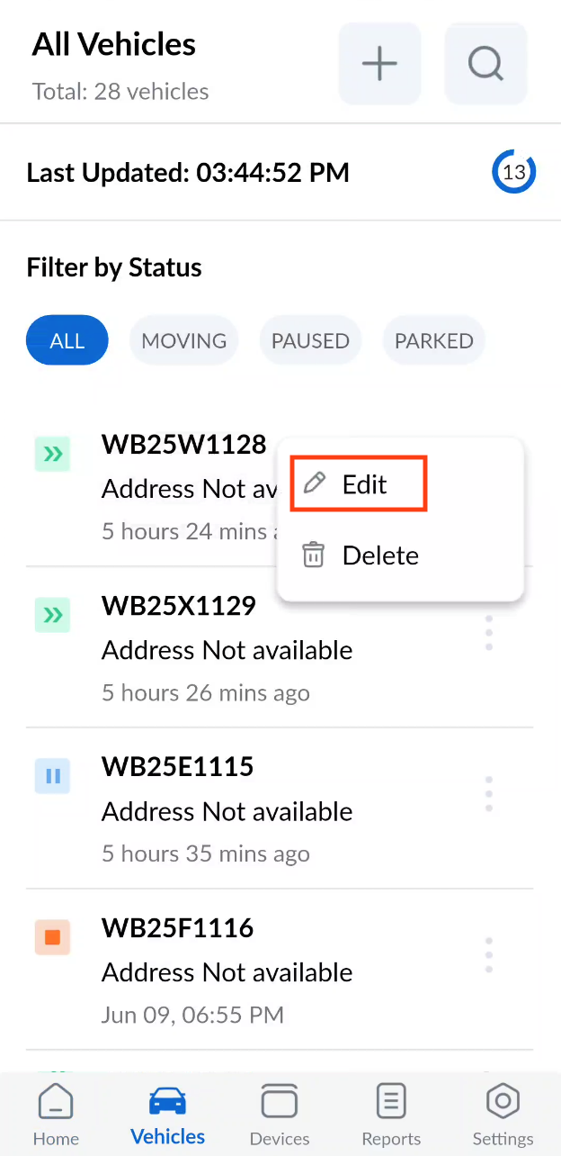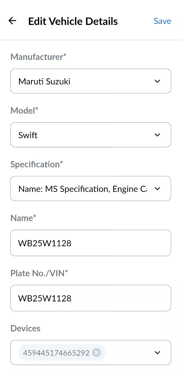 You can edit the vehicle by tapping on the tripple dots icon at the right side of each and every vehicle and choosing edit from the dropdown. An Edit Vehicle Details form will appear similar to the new vehicle form. Update the required information and tap on "Save" button.