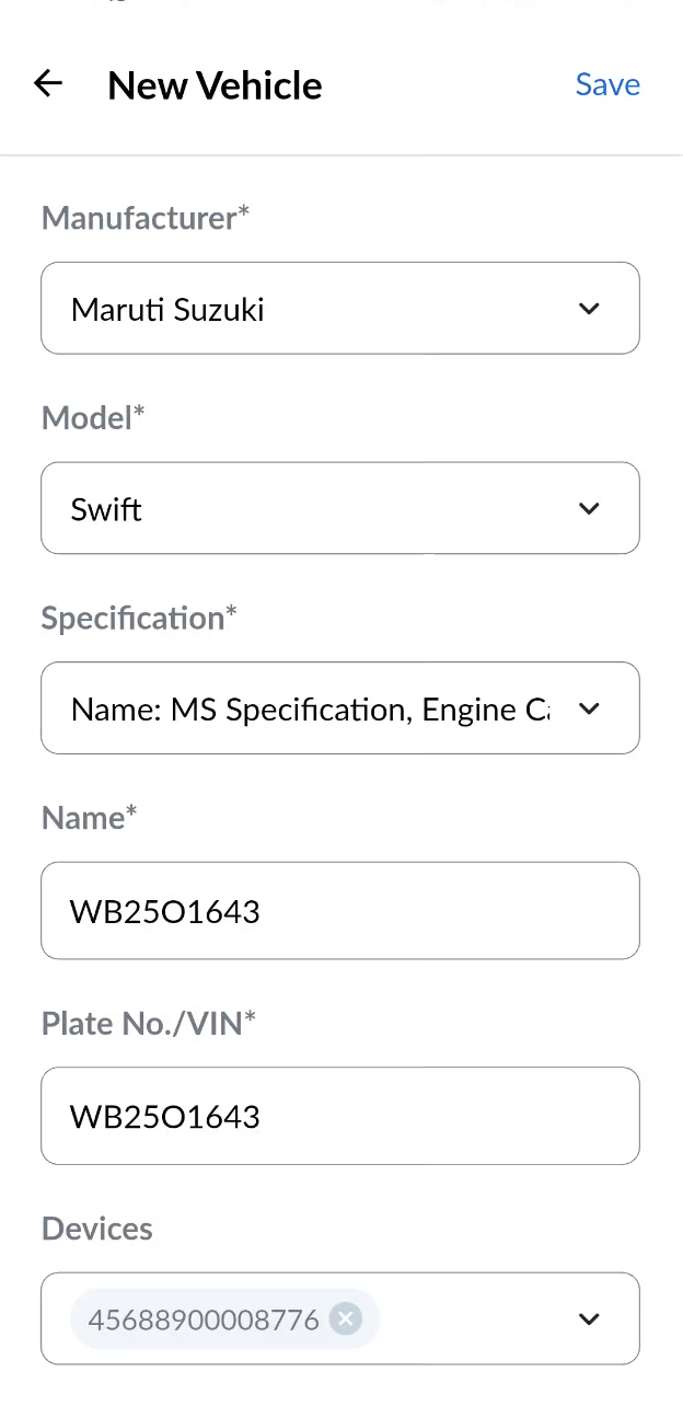 To create a new vehicle, tap the ‘+’ button located at the top of the screen. This opens the "New Vehicle" form.