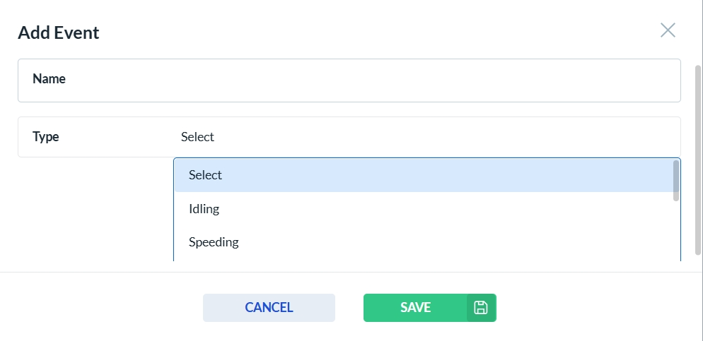 To add a new Event, click the Add New button. This will open the Event form. Select the event type from the Type dropdown. Complete all required fields, then click Save to create the new Event, or Cancel to discard your changes.