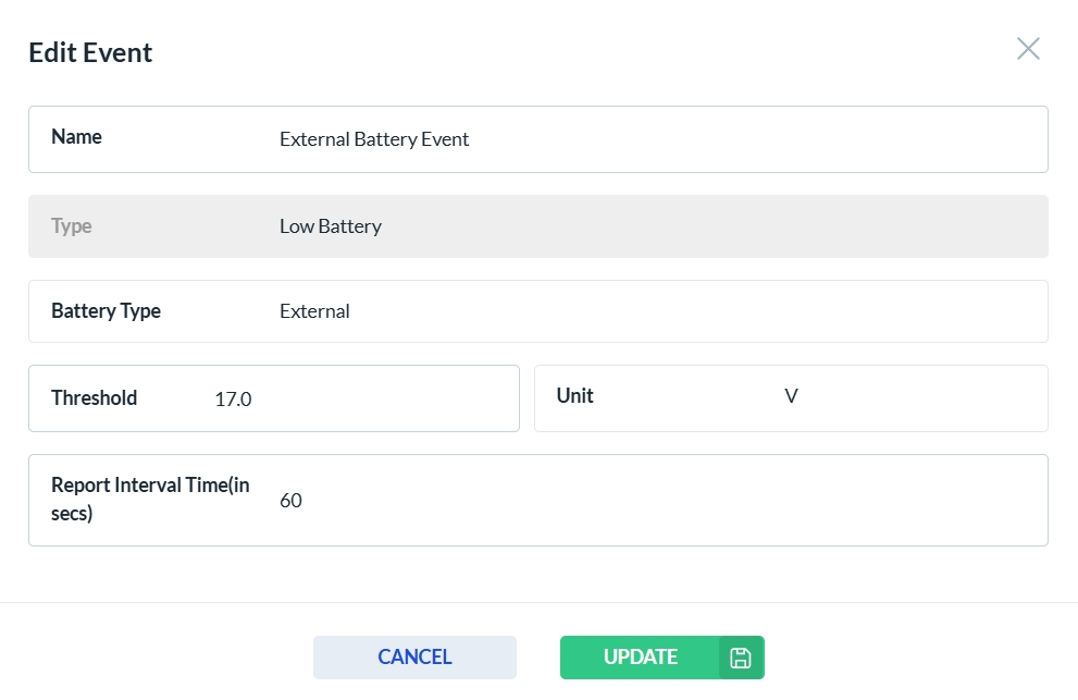 After clicking the edit icon in the Actions column, the Event form opens. Only the fields that are enabled can be edited—disabled fields are read-only. Click Update to save your changes, or Cancel to discard them.