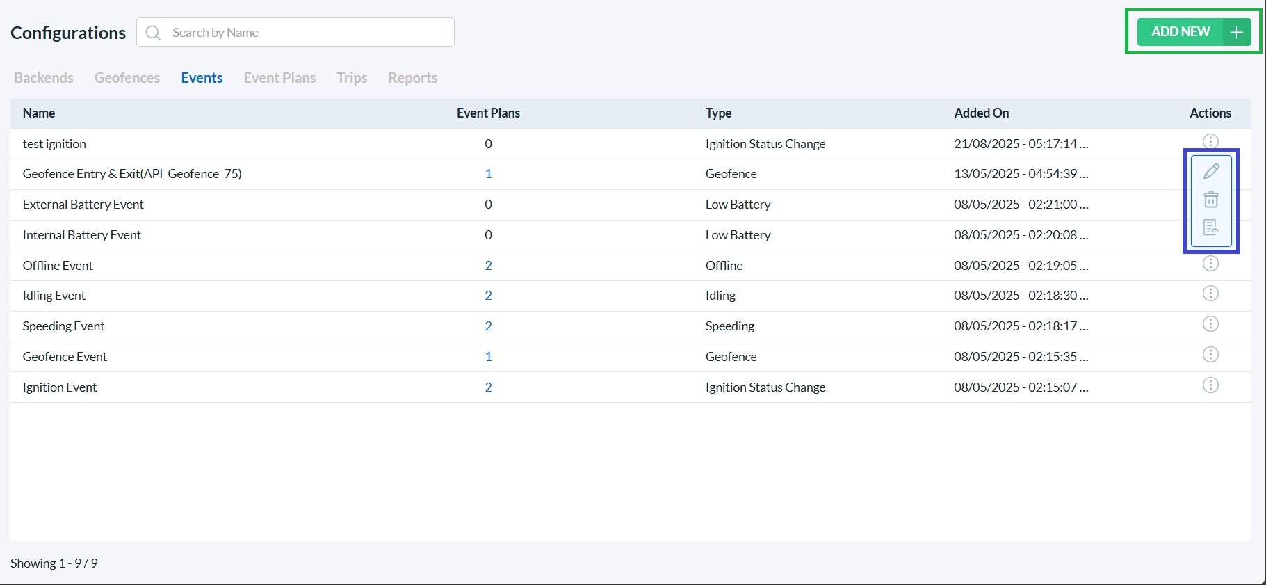 To add a new event, click on the Add New button. (highlighted with a green box)
