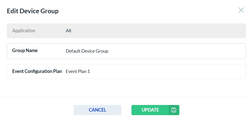 After clicking the edit icon in the Actions column, the Device Group form opens. Only the fields that are enabled can be edited—disabled fields are read-only. Click Update to save your changes, or Cancel to discard them.