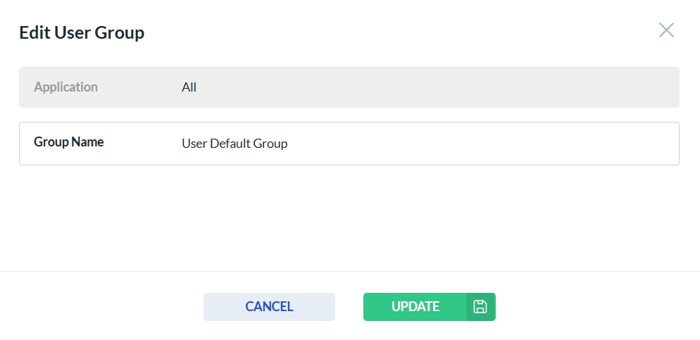 After clicking the edit icon in the Actions column, the User Group form opens. Only the fields that are enabled can be edited—disabled fields are read-only. Click Update to save your changes, or Cancel to discard them.