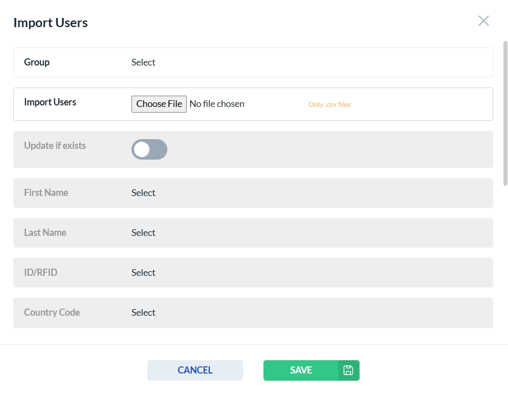 To import users in a group, click the Import button or the Import icon from the Actions column. This will open the User Group import form. Choose a csv file to import user group. Complete all required fields, then click Save to store the new User Group or Cancel to discard your changes.