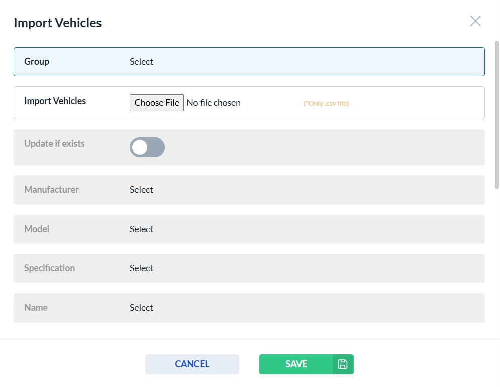 To import vehicles in a group, click the Import button or the Import icon from the Actions column. This will open the Vehicle Group import form. Choose a csv file to import vehicle group. Complete all required fields, then click Save to store the new Vehicle Group or Cancel to discard your changes.