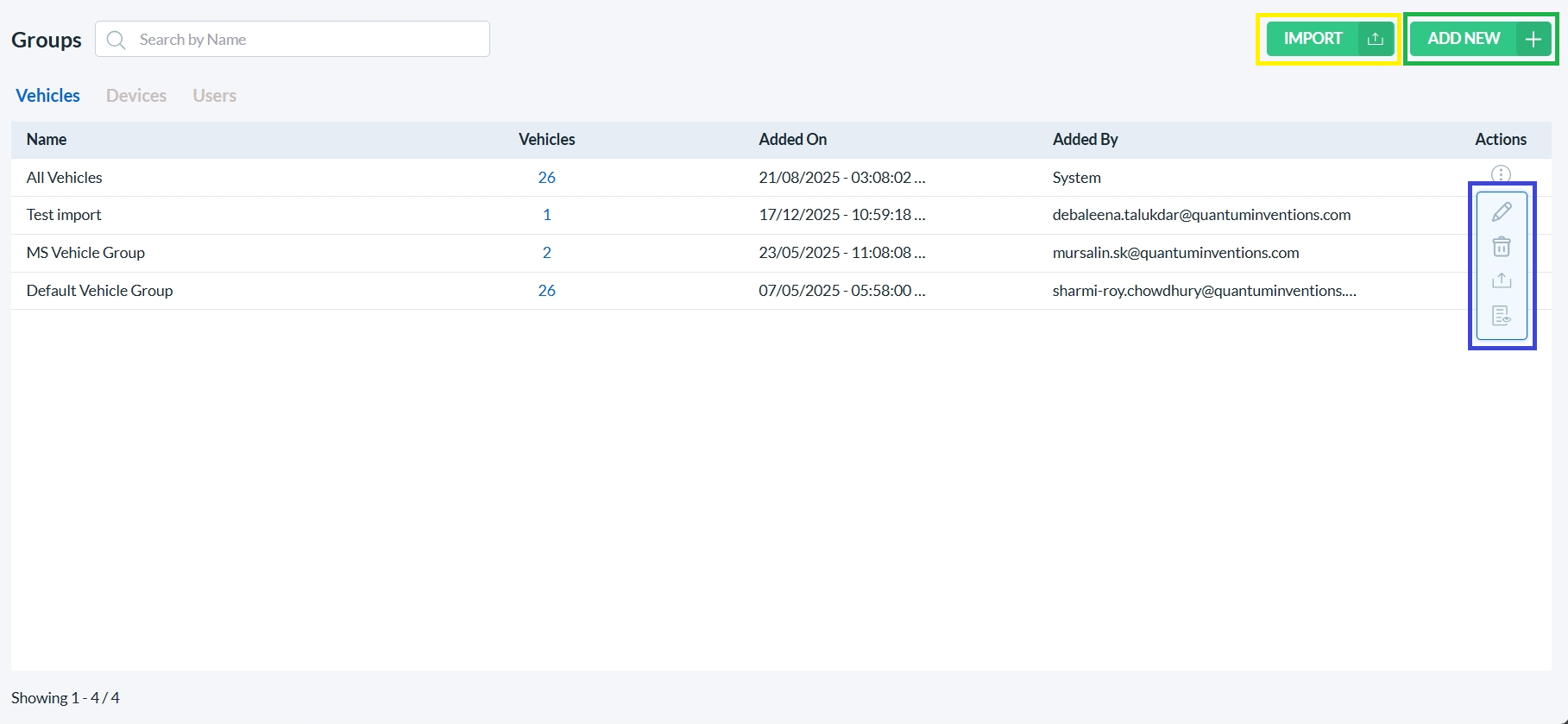 To edit a Vehicle Group or view its audit trail or delete it, click on the corresponding icon in the Actions column (highlighted with a blue box).
