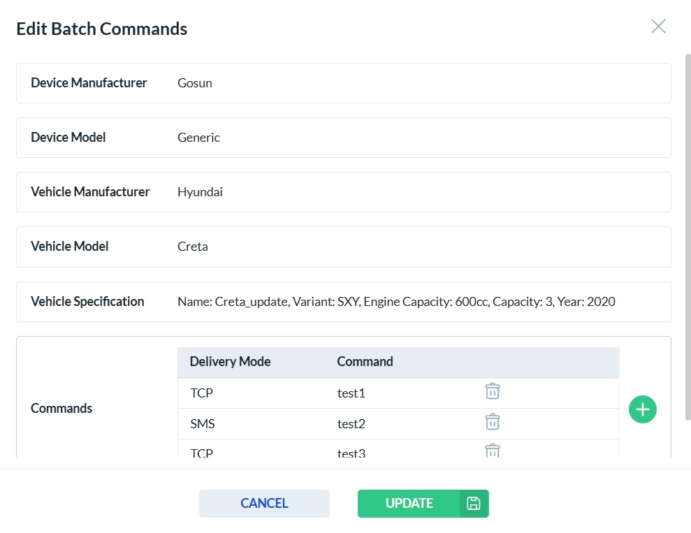 After clicking the edit icon in the Actions column, the Batch Command form opens. Only the fields that are enabled can be edited—disabled fields are read-only. Click Update to save your changes, or Cancel to discard them.