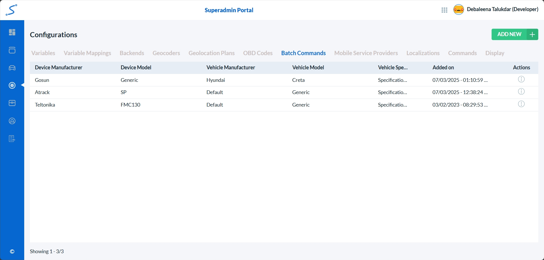 After logging into the Super Admin Portal, select Configurations from the left navigation panel and choose the Batch Commands sub-tab. This page allows administrators to view, create, manage, schedule and run batch command templates that can be executed against devices.