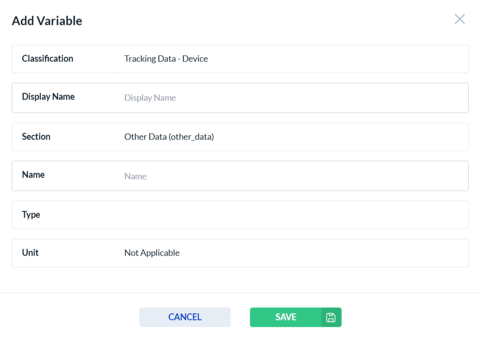 To add a new variable, click the Add New button. This will open the variable form. Complete all required fields, then click Save to store the new variable or Cancel to discard your changes.