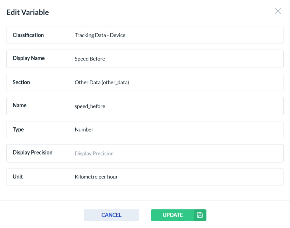 After clicking the edit icon in the Actions column, the variable form opens. Only the fields that are enabled can be edited—disabled fields are read-only. Click Update to save your changes, or Cancel to discard them.