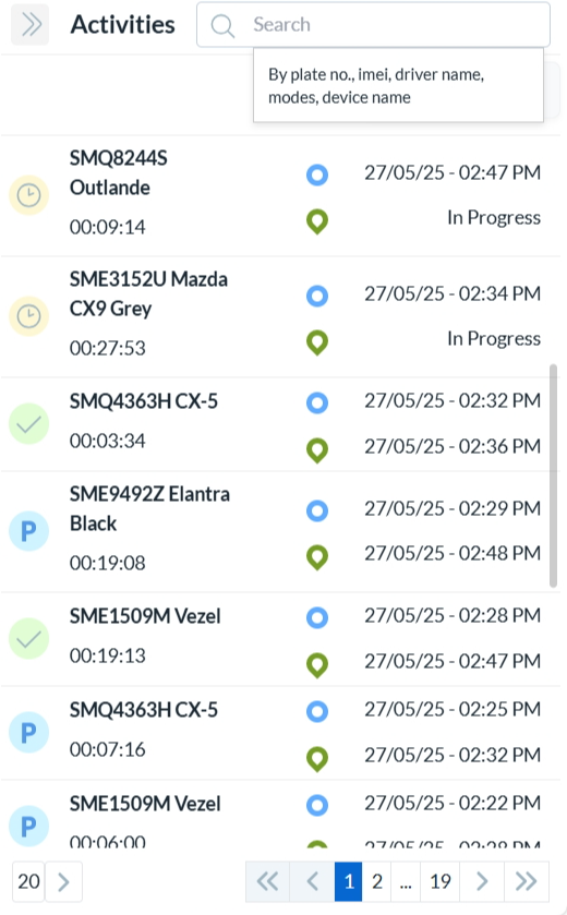 The activity status - In Progress or P for Parked or Tick Mark for Trip.